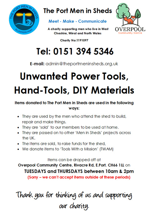 Currently, The Port Men in Sheds is based at Overpool Community Centre, Rivacre Road, E.Port CH66 1LL and we are open to men, aged 18+, in all surrounding areas.